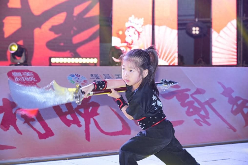 紧接着,来自鳌头官地村、年仅5岁的“小小非遗传承人”黄子君现场耍起了关刀,动作流畅有力,引来现场一片片叫好,观众们也纷纷赞叹着拿起手机记录。“这次参加村晚很开心,希望大家可以来鳌头看我们的非遗洪拳。”她的声音稚嫩且坚定。